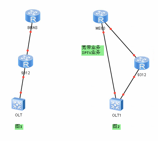 将下挂在汇聚交换机的OLT进行业务割接(如图1), 将OLT的宽带和IPTV业务直接上行至BRAS(如图2),这样可以释放汇聚交换机上行压力,保证业务正常运行。