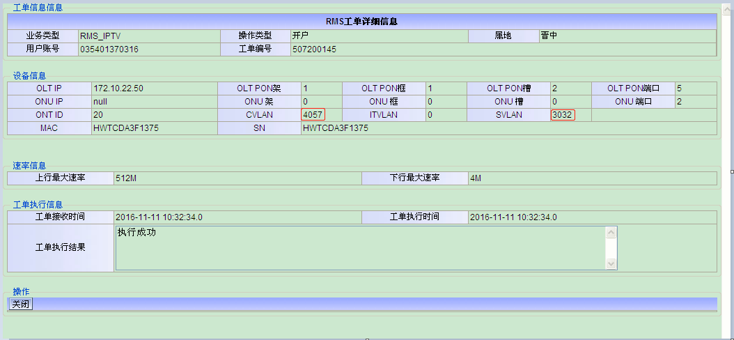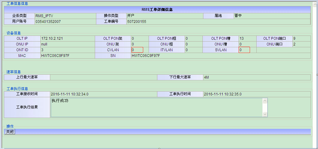 4.3.1典型案例一:00365533中兴OLT下挂华为EPON互通猫,线务员反映为IPTV加装,第一次加装后机房看不到IPTV数据,这是第二次加装。中兴下挂EPON互通猫只能在RMS平台查看下发的数据,确实没有IPTV装的记录。但是线务员说该机顶盒在社区配置完成可以使用,从亚信岗也可以看到机顶盒的mac已正常注册。查九七流程,发现装IPTV时“业务唯一标示”处为空白,流程报错。手工在RMS上加IPTV数据,可以点播(机顶盒获取IP很快从192.168段自动变成正常);手工在OLT上加receiver-port,可以直播。