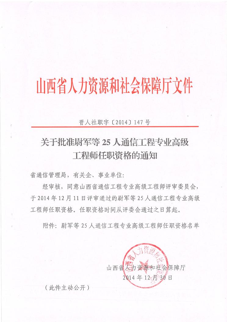 关于批准尉军等25人通信工程专业高级工程师任职资格的通知