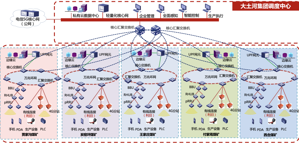 技术特点: 大土河及旗下五座煤矿统一规划IPRAN万兆工业环网及井下5G无线通信系统网络覆盖,采用新型IPRAN万兆环网支持高带宽、低时延、数据切片技术,通过集团、煤矿多区域多矿井组网实现扁平化管理,构建大土河自主可控的专有网络,提供更加贴近行业应用的定制服务,为未来煤矿智能化应用的接入打下坚实的硬件基础。