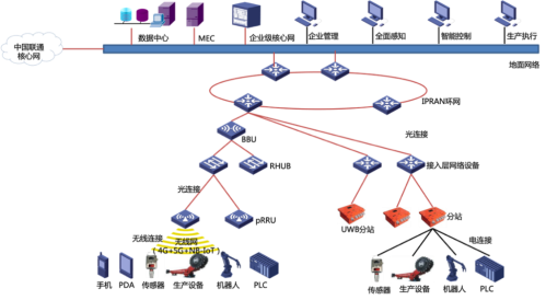 麻家梁煤矿5G+万兆环网由地面的核心网元(企业级核心网、MEC)、基带控制单元(BBU)、远端数据汇聚单元(RHUB)、微型射频拉远单元(pRRU)等设备构成。
