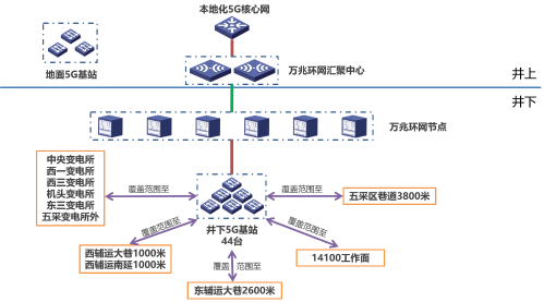 井下安装部署完成46台5G基站,5G网络覆盖范围包括中央变电所、机头变电所以及西辅运至1900米、西辅运南延至1000米、西辅运大巷至900米、东辅运至2500米、五采区至3800米、665水平西辅运大巷(西延)、665西辅运巷(南延)、665水平辅运巷、665水平东辅运大巷、665水平胶带大巷(西延)、665西胶带大巷(南延)、665水平胶带运输巷、665水平东胶带大巷、14100胶带巷、14100辅运巷、14100综采工作面、副井提升、主井提升底、车场、空车巷等区域。