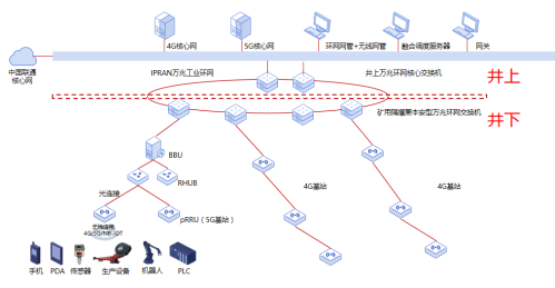 IPRAN环网由地面的万兆环网核心交换机和井下的矿用隔爆兼本安型万兆环网交换机组成50GE骨干网络,以支撑原有工业环网和新建4G+5G移动通信等业务。