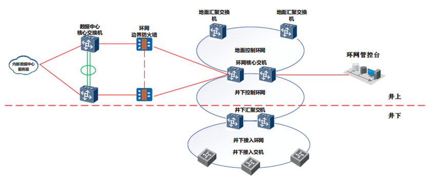 以数智化控制中心大楼一层机房的环网核心交换机为起点,沿管线井、辅运暗斜井敷设线路至下组煤变电所(部署环网交换机),再经胶带暗斜井、301皮带巷、主斜井返回数智化控制中心大楼一层机房的环网核心交换机,形成闭合的井上井下5万兆汇聚工业环网,实现井上与井下核心数据的高速传输。