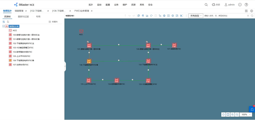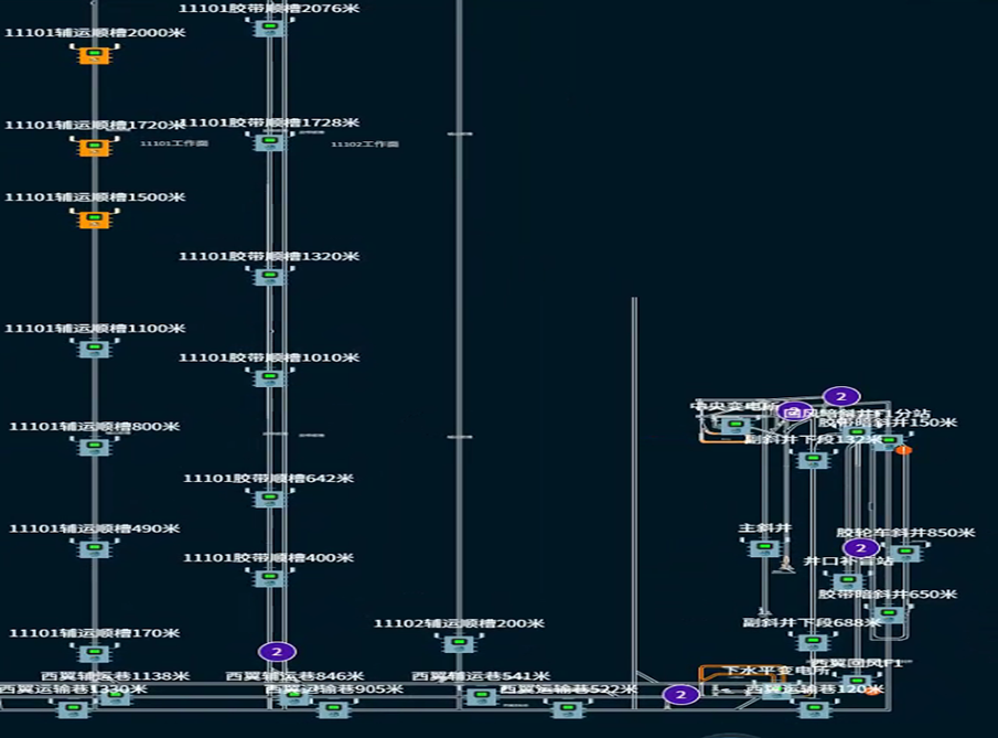以下组煤变电所的环网交换机为中心,向110102辅运顺槽口、西翼胶带巷巷口配电点、中央变电所(上水平)敷设线路,最终返回下组煤变电所的环网交换机,形成井下万兆接入工业环网,覆盖井下关键配电与传输节点。