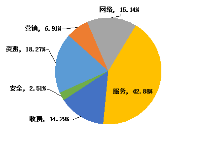四季度,省局电信用户申诉受理中心(以下简称受理中心)共收到电信用户申诉、咨询和回访用户14055人次。从电信用户申诉咨询热点问题分类统计情况看,服务类问题占比最大,占总量42.88%,其次为资费类和网络类问题,分别占18.27%和15.14%,收费类和营销类问题分别占14.29%和6.91%,安全类问题占2.51%,详见下图。